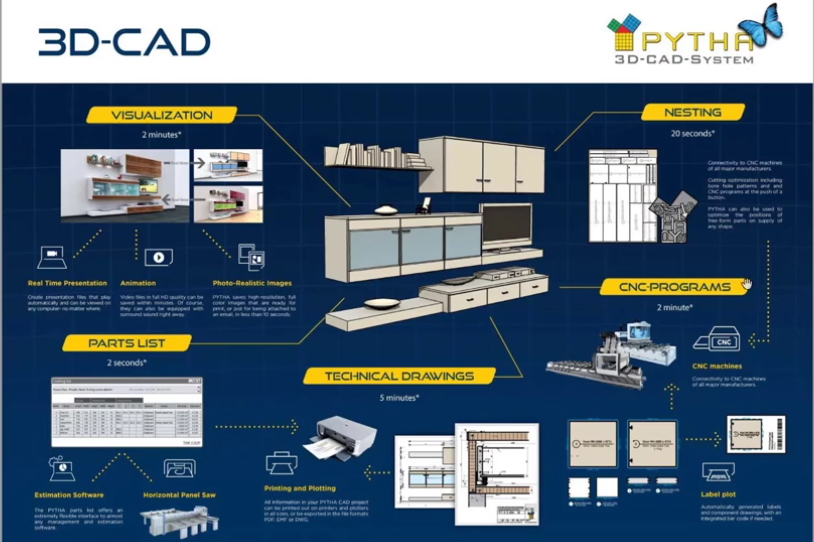当社工場は最新鋭の5軸制御CNCマシニングセンタ(イタリア SCMグループ社製 morbidelli m100)と家具・造作用3DCAD/CAMソフト『PYTHA 3D CAD』により家具製作の工程をデジタル化しております。